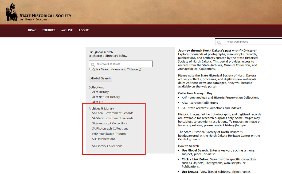The State Historical Society of North Dakota’s new searchable database—fiNDhistory—allows the public to view, browse, and search holdings as they are added, scanned, and edited in real time. Here are three tips to search for State Archives collections on the site: