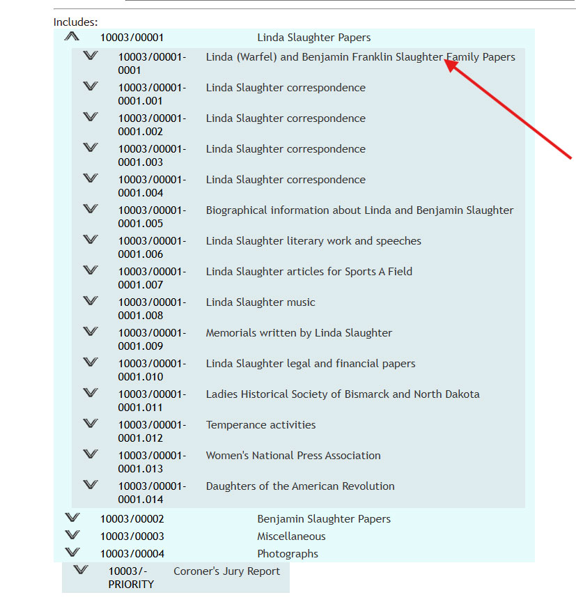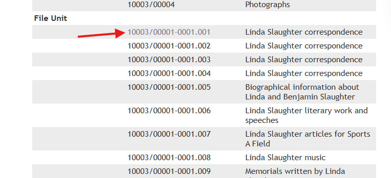 To view an entire collection, conduct a global or directory-specific search. You can narrow a search to “collection” for archival level or select a collection level record from global search results by clicking on the collection number. At the bottom of the page, after the collection-level description, there is a section listing the materials in the collection. These might include series, file unit, and item records.
