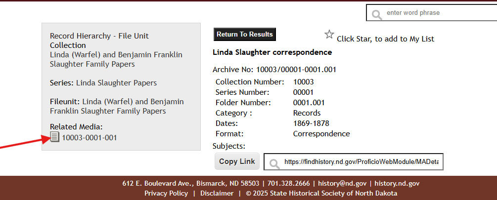 Then, if documents or other resources have been digitized (into nonimage formats), there will be a file under related media. Click the file name (not the icon) to access the file.
