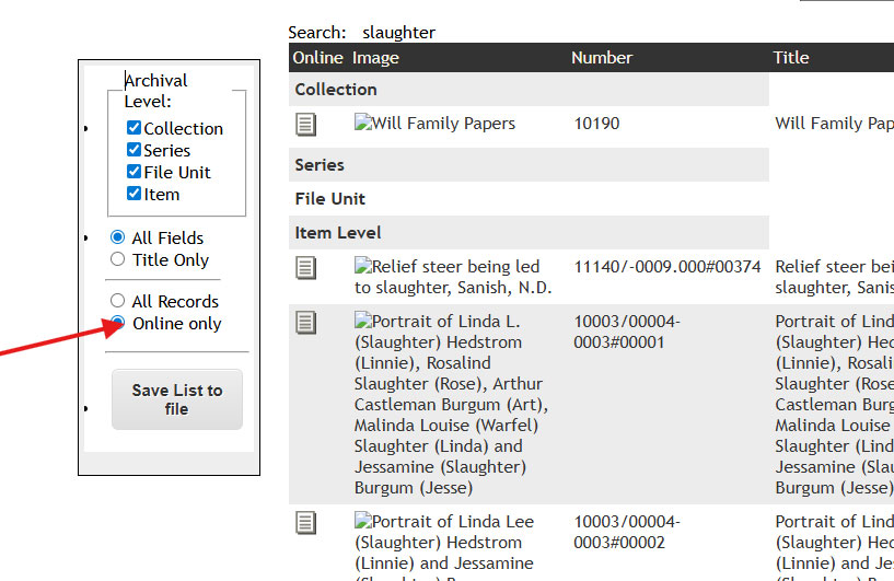 Note that a search may be restricted to “online only,” revealing only those results with records or adjacent records (such as collections with at least one digitized item within).